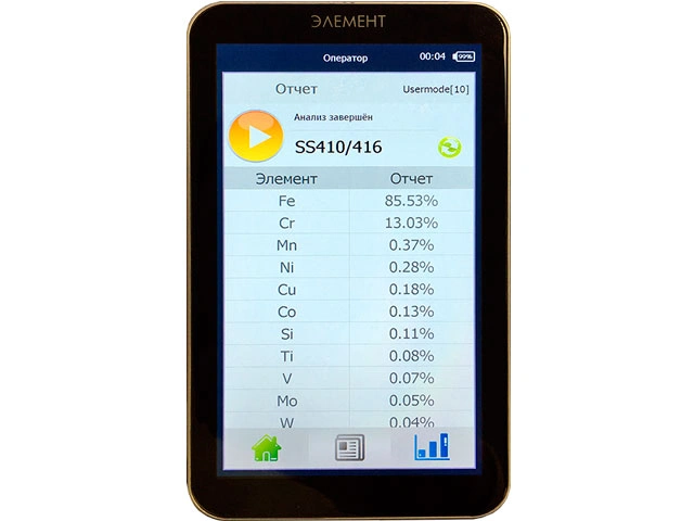 Работать со спектрометром для анализа металлов и сплавов могут специалисты разного уровня подготовки. Встроенное ПО управляет процедурой анализа, обработки результатов, их сохранения и отражения на экране устройства. Для удобства использования возможна работа в двух режимах: пользовательский, при котором производится выбор типа анализируемого образца и запуск процесса контроля одной кнопкой или экспертный, при этом доступно добавление элементов и калибровочных кривых для проведения более углубленного исследования характеристик образца. Заданные системные алгоритмы позволяют получать достоверные результаты измерений (без искажений).