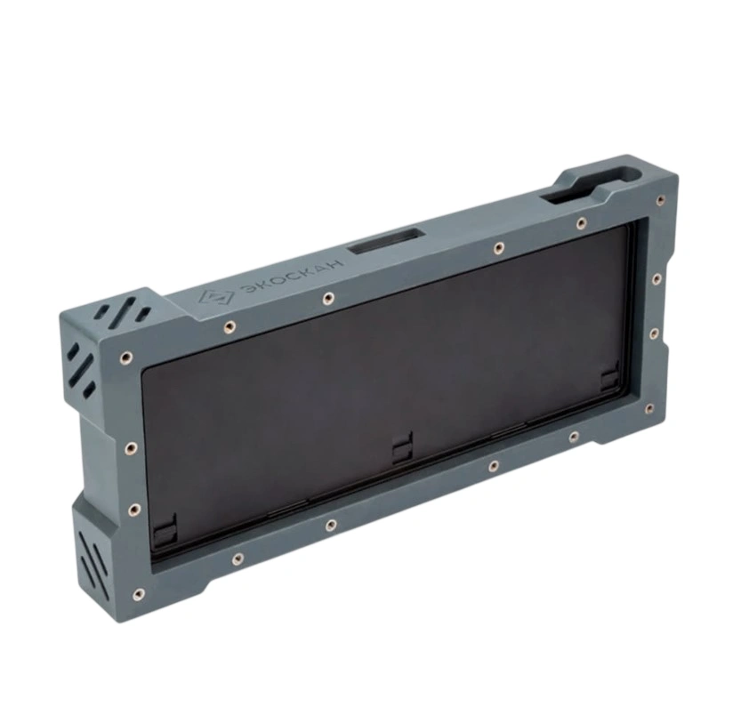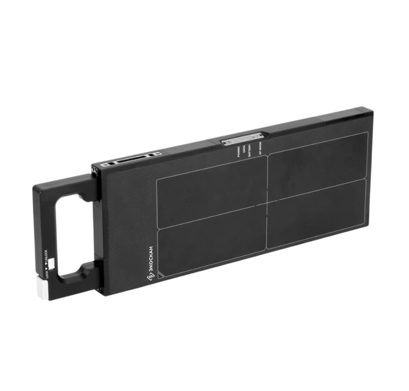 Корпус детектора выполнен с уровнем защиты IP67, что обеспечивает устойчивость к влаге и пыли. Масса устройства составляет 3,2 кг, а компактные габариты 25 × 160 × 400 мм упрощают транспортировку и установку на объекте. Питание детектора возможно как от сети, так и от сменных аккумуляторов, что позволяет использовать систему в полевых условиях и на действующих производственных объектах. Дополнительный комплект аккумуляторов увеличивает время автономной работы и позволяет производить контроль без остановки на подзарядку.