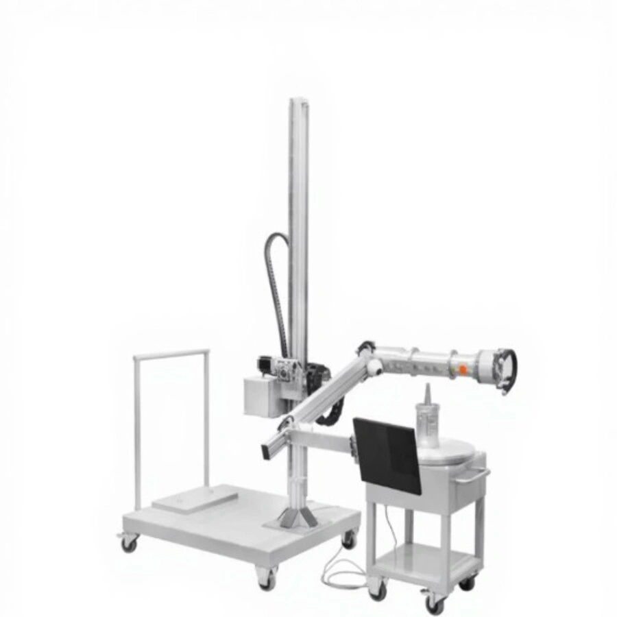 Конструкция имеет две моторизованные степени свободы и вертикальный ход стрелы до 1800 мм, что позволяет настраивать систему под любые геометрические формы изделия.