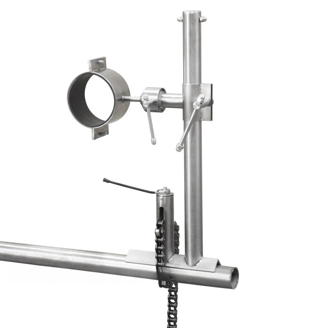 Конструктивно ШРТ-1М/100 – это стойка с основанием, оборудованная креплением цепного типа и натяжным трещоточным механизмом с возможностью переключения направления вращения. Также на стойке располагается держатель рентгеновского блока в виде хомута с шаровым механизмом и кареткой.