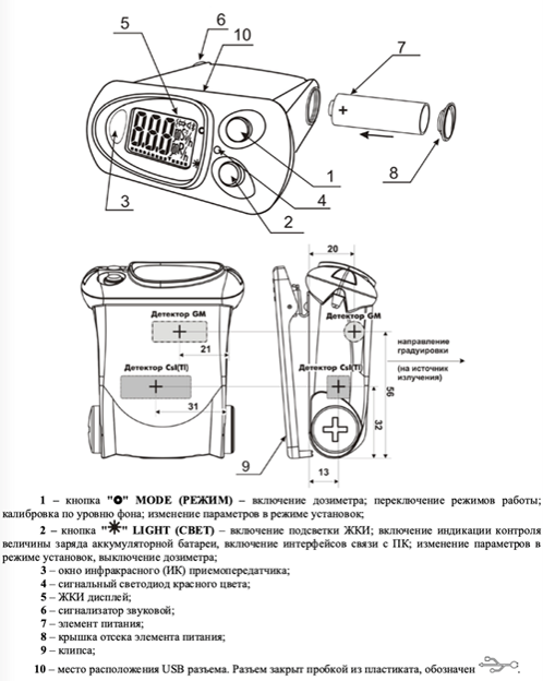 - тугой зажим на корпусе, с помощью которого дозиметр можно прочно закрепить на одежде.