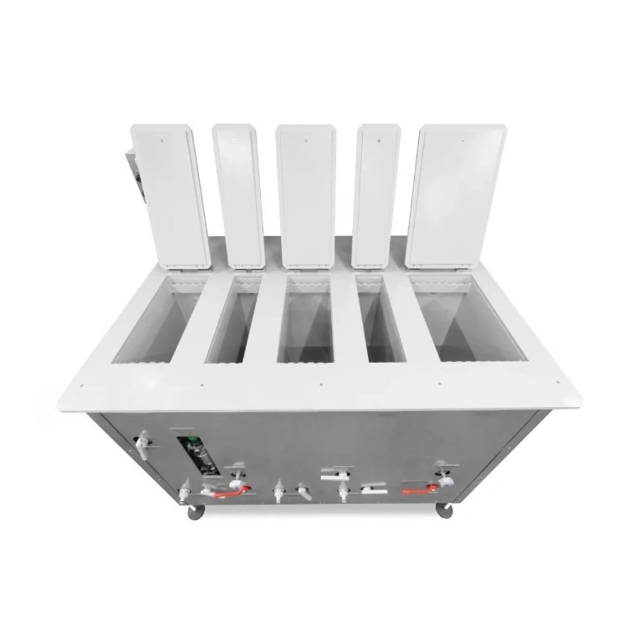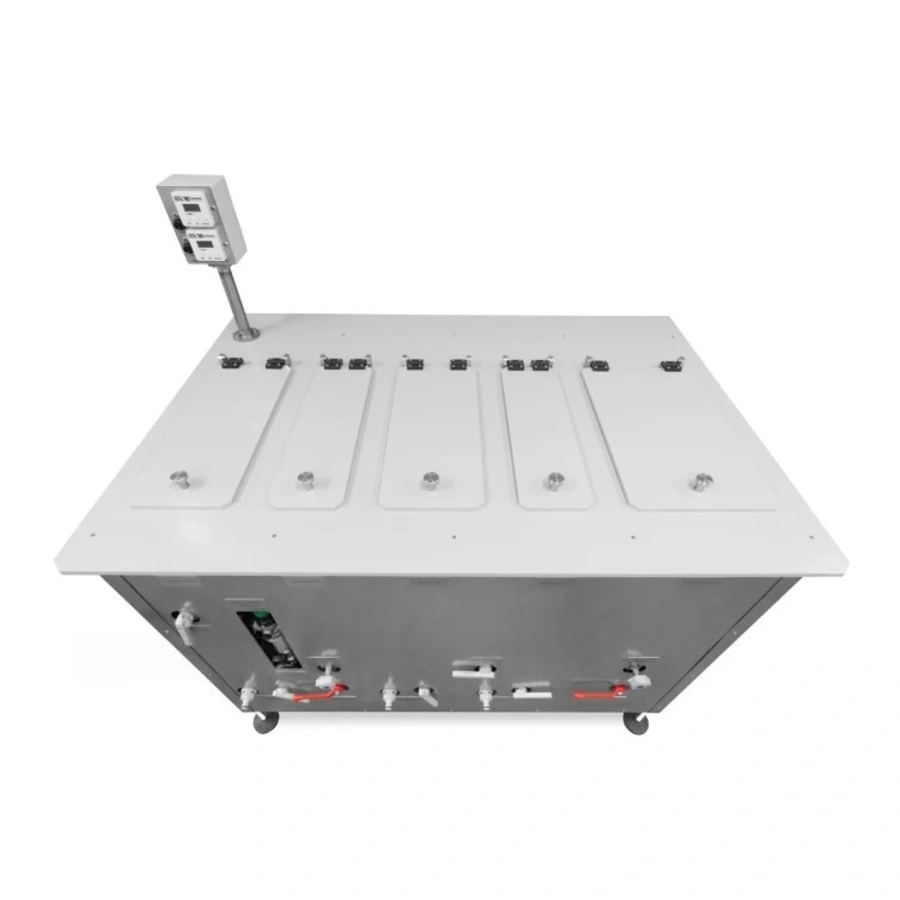 Конструктивно установка выполнена на базе системы прямоугольных баков с оптимально подобранными внутренними габаритами. Каждый этап химической обработки — проявление, промежуточная промывка, фиксация и финальная промывка — реализован в отдельной емкости с уровнем жидкости 500 мм. Такая схема обеспечивает равномерное воздействие растворов на пленку и позволяет одновременно обрабатывать до 10 кассет на основных этапах и до 15 кассет на стадии окончательной промывки, что удобно при использовании радиографического метода в условиях высокой загрузки.