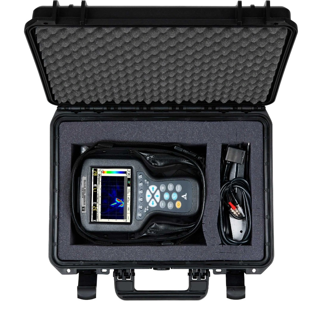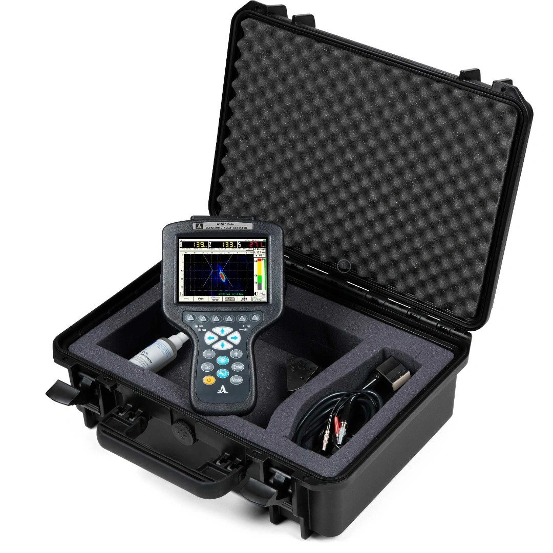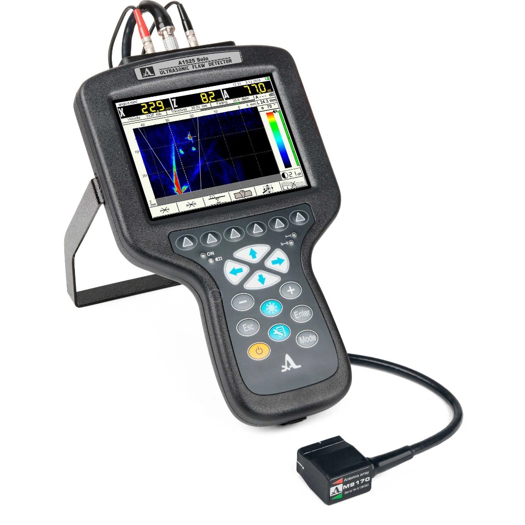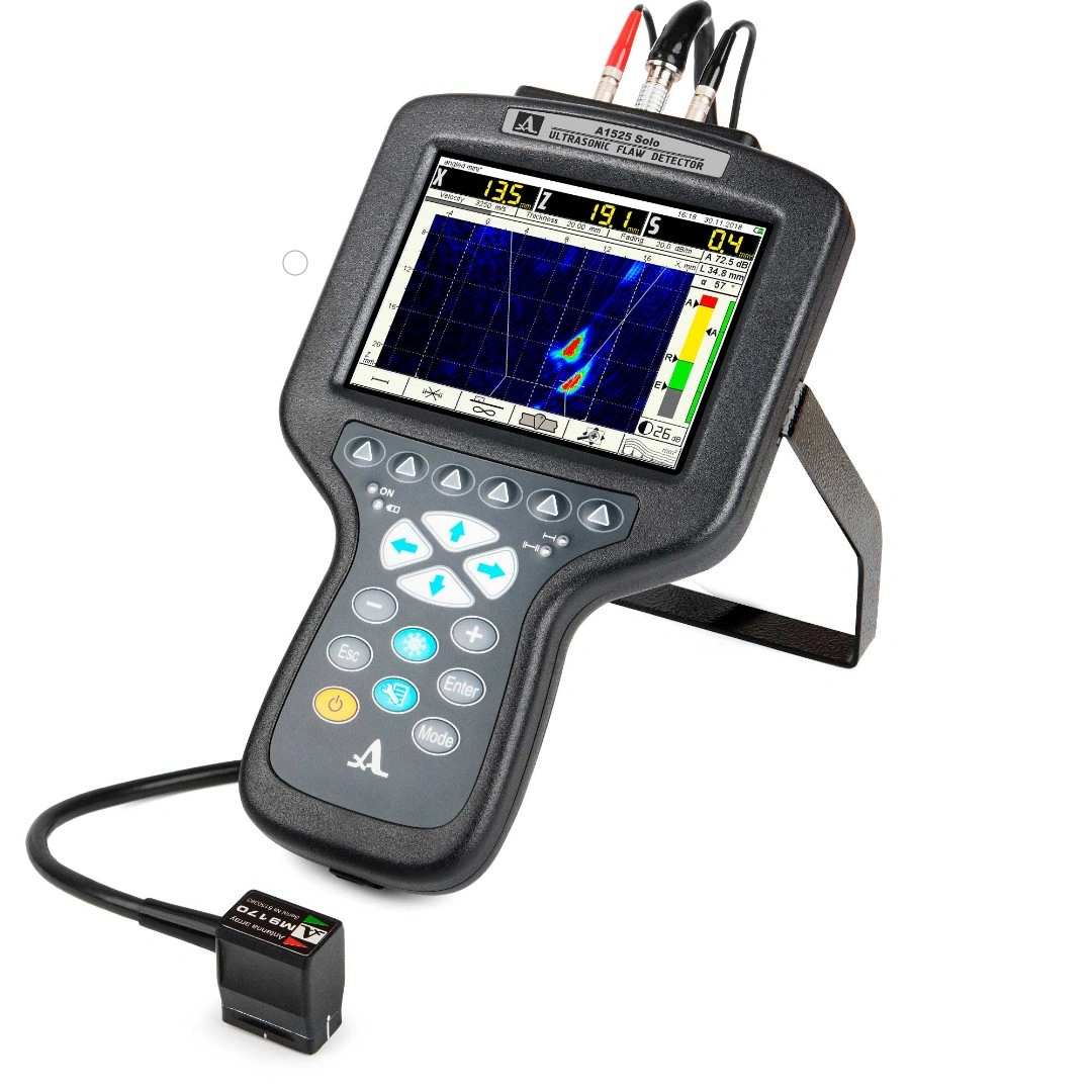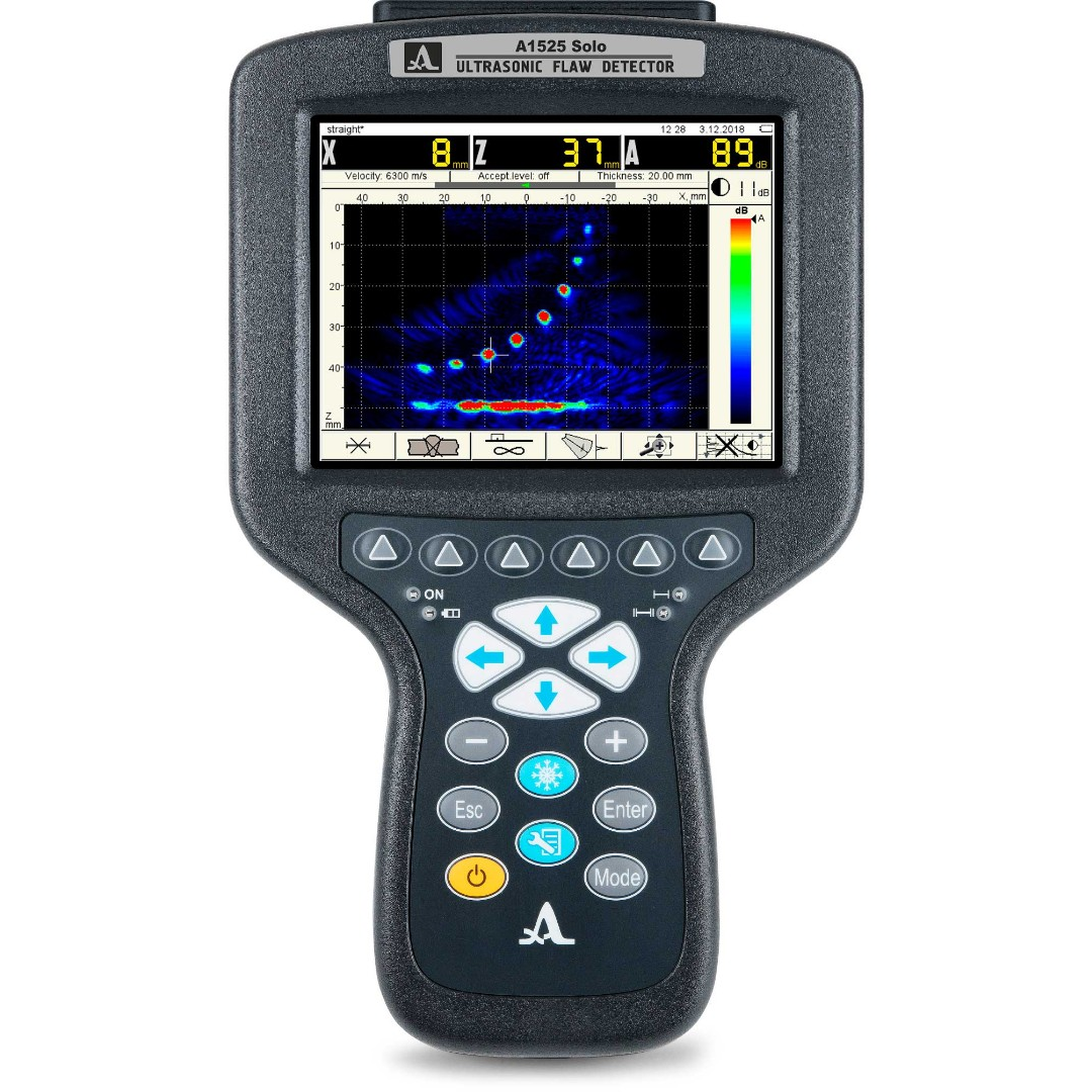 Компактный ручной УЗК дефектоскоп-томограф А1525 Solo включает в состав электронный блок с большим цветным антибликовым 5,7″ TFT экраном (640 x 480 пикселей) и пленочной панелью управления. К нему при помощи кабеля подключаются ПЭП или цифрофокусируемые антенные решетки (АР). Эргономичный корпус обеспечивает удобство управления прибором.