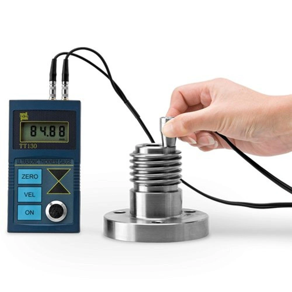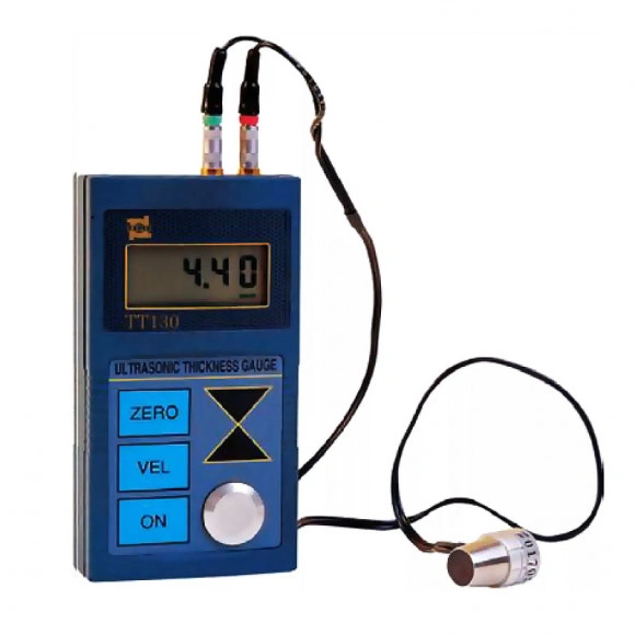 Интерфейс ультразвукового толщиномера TT 130 интуитивно понятен, прибор прост в использовании, точен и надежен. Полученные в ходе проведения анализа значения отражаются в миллиметрах или дюймах. В комплект поставки входят два ПЭП (прямой и угловой) с диаметром контактной поверхности не более 10 мм, работающие на частоте 5 МГц.
