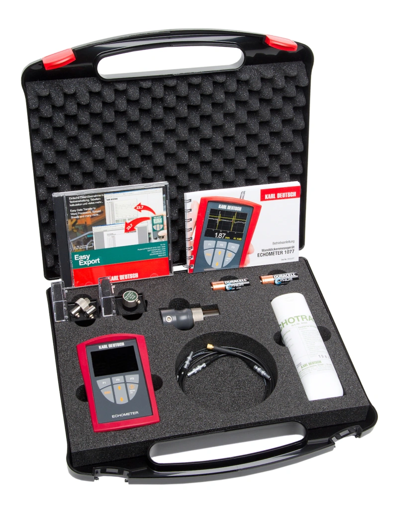 Ручной ультразвуковой толщиномер ECHOTEST 1077 DATA включает в себя портативный измерительный электронный блок с цветным TFT экраном с подсветкой (240 х 320 пикселей) и кнопками управления на передней панели, в верхней части прибора расположен специальный разъем, к которому при помощи кабеля подключается пьезопреобразователь (совмещенный, раздельно-совмещенный).