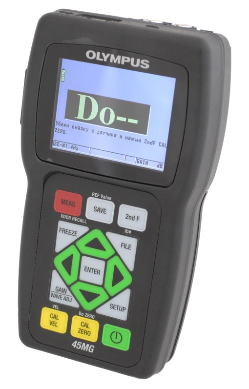 Ручной ультразвуковой толщиномер 45MG состоит из портативного измерительного электронного блока с цветным ЖК экраном (320*240 пикселей) с электролюминесцентной подсветкой и панелью для управления прибором на передней части, с помощью кабеля к устройству подключается пьезопреобразователь (одноэлементные или раздельно-совмещенные).