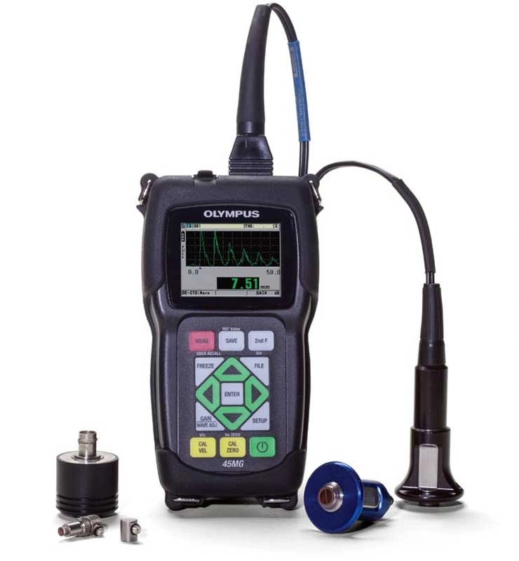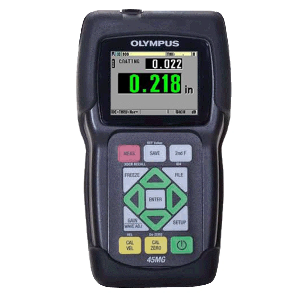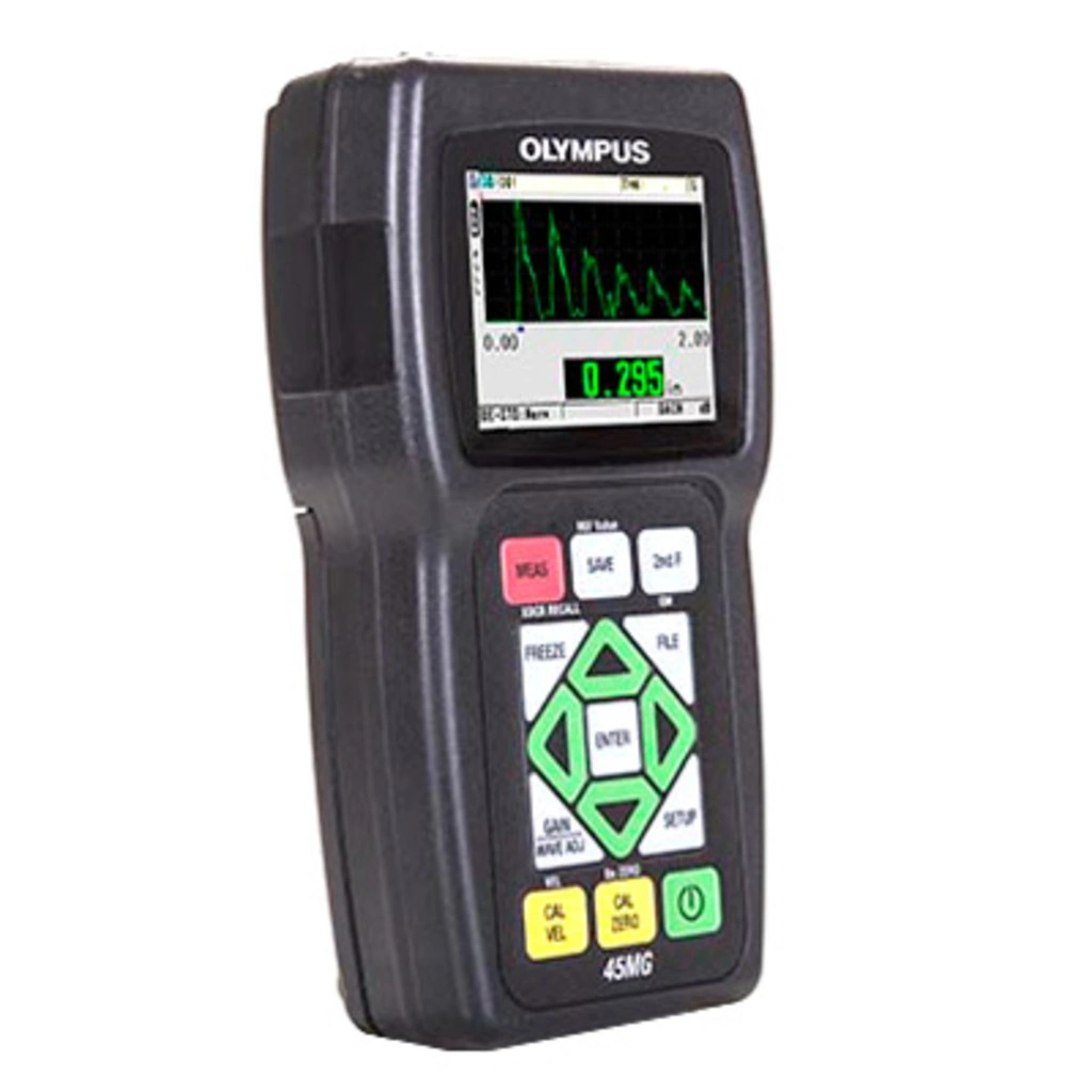 Модель ультразвукового толщиномера 45MG отличается возможностью автоматического распознавания типа используемого ПЭП, производит замеры на нагретых объектах (до 500 ºC), работает в дифференциальном режиме. Изображение В-скана устройства позволяет преобразовать измеренные величины толщин, отображая их в виде поперечного сечения контролируемого изделия, что наглядно показывает изменения толщины по мере перемещения датчика.