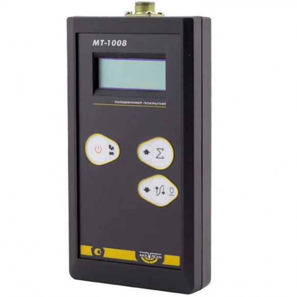 Ручной компактный магнитный толщиномер МТ-1008 для экспресс-контроля состоит из портативного измерительного электронного блока на лицевой части которого расположен цифровой дисплей и панель управления прибором. На верхнем торце устройства измерения толщины расположен разъем для подключения пьезоэлектрических преобразователей (включаются в комплект поставки в соответствии с потребностями заказчика).