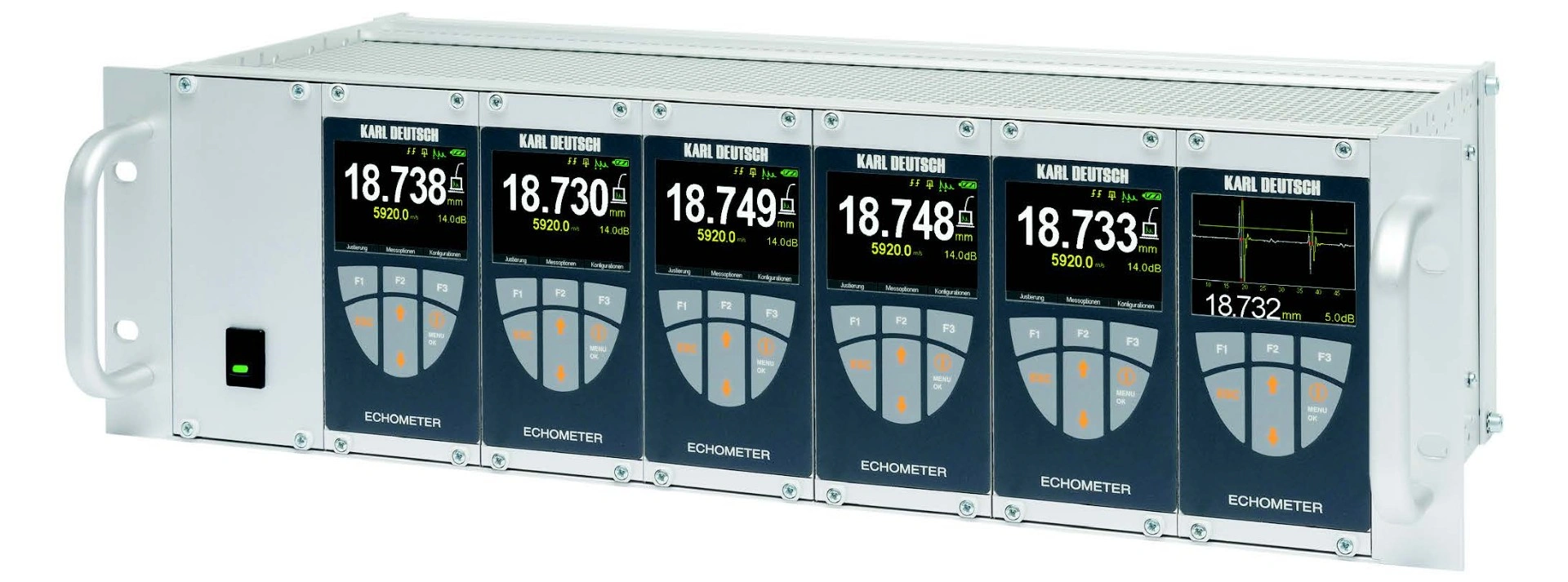 Диапазон скоростей распространения ультразвука в анализируемых материалах при ведении неразрушающего контроля находится в пределах от 100 до 19 999,9 м/с. Величины измеряемые ультразвуковым толщиномером находится в пределах от 0,25 до 500 мм (зависит от выбранного режима работы и типа датчика). Питание многоканальной версии прибора для измерения толщины изделий ECHOTEST 1077 DATA осуществляется от блока питания (напряжение от 110 до 240 В). Модификация устройства для автоматизированных систем выпускается в укороченном корпусе (без собственного источника питания).