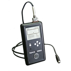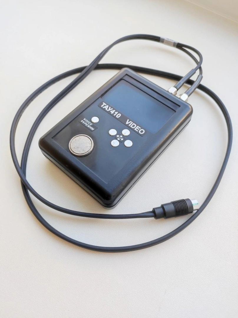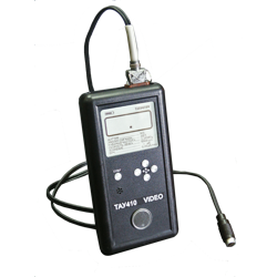 Ручной ультразвуковой толщиномер ТАУ 410 Video включает в себя портативный измерительный электронный блок с ЖК экраном, панелью управления и юстировочным образцом (6мм) на передней панели, к устройству подключается выносной датчик (пьезопреобразователи с рабочей частотой 1.25, 2.5 и 5 МГц). В верхней части прибора расположены сигнальный разъем и кнопки регулировки сигнала.